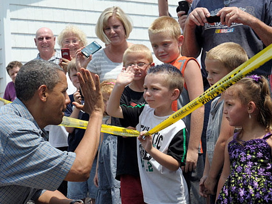 The curiosity of the group quickly morphed into shock when the motorcade slowed to a stop and President Obama emerged from a limousine with secret service agents. Jubilation filled the air as the crowd excitedly converged around the president, pressing close to take pictures with cell phones and pawing for autographs.